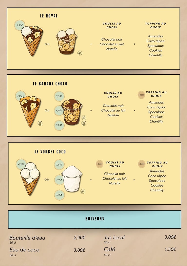 Savourez notre sorbet coco et bananes chocolat en Guadeloupe.